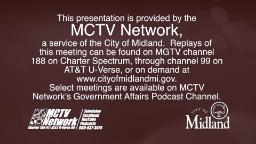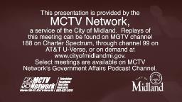 The MCTV Network operates four cable access TV channels on Charter Spectrum and DIRECTV U-Verse. MCTV also offers video online and audio podcast services to community media producers. These channels contribute to a sense of community, providing hyper-local content, transparency in government and a free speech forum to individuals and organizations. For more information about this service, visit www.cityofmidlandmi.gov/mctv or follow MCTV on Facebook.